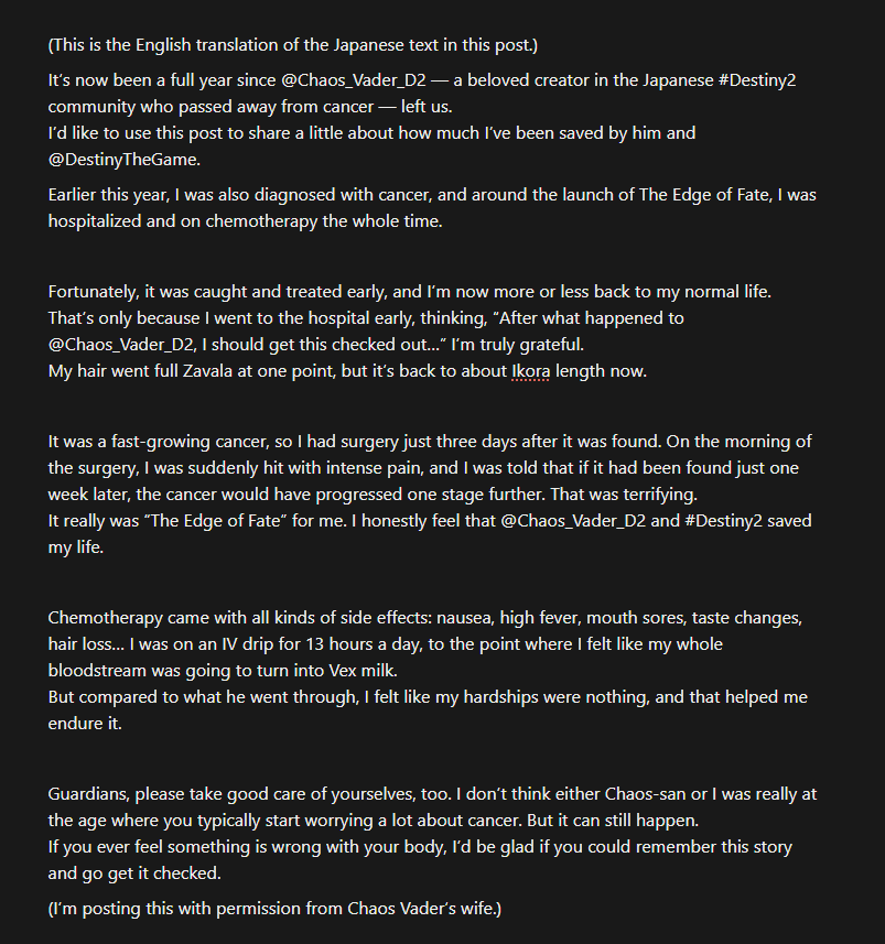 2025-12-08 — Year of Prophecy - Renegades / Season of Lawless (S28)It's been a year since Chaos Vader passed away. Let me share a little about how Chaos-san and @DestinyTheGame saved me. Actually, this year cancer was found in me as well. Around the launch of Frontier of Fate, I was hospitalized receiving chemotherapy.