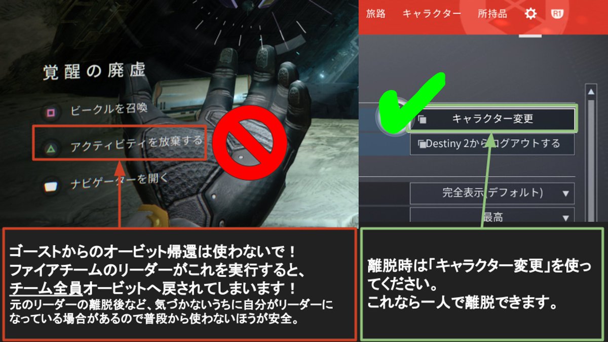 2024-04-03 — Lightfall / Season of the Wish (S23)Posting this notice due to recent complaints. When leaving the team, please avoid using "Return to Orbit" from Ghost. In #D2SpoilsGiveaway, if the randomly selected leader after I leave does this, entire team gets kicked to orbit. Use character swap instead for a clean solo exit. #Destiny2